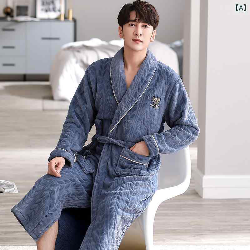 バスローブ メンズ パジャマ ルームウェア 高級感 秋冬 厚手 裏起毛 ロング丈 サンゴフリース フランネル ポリエステル あったか 快適 Vネック