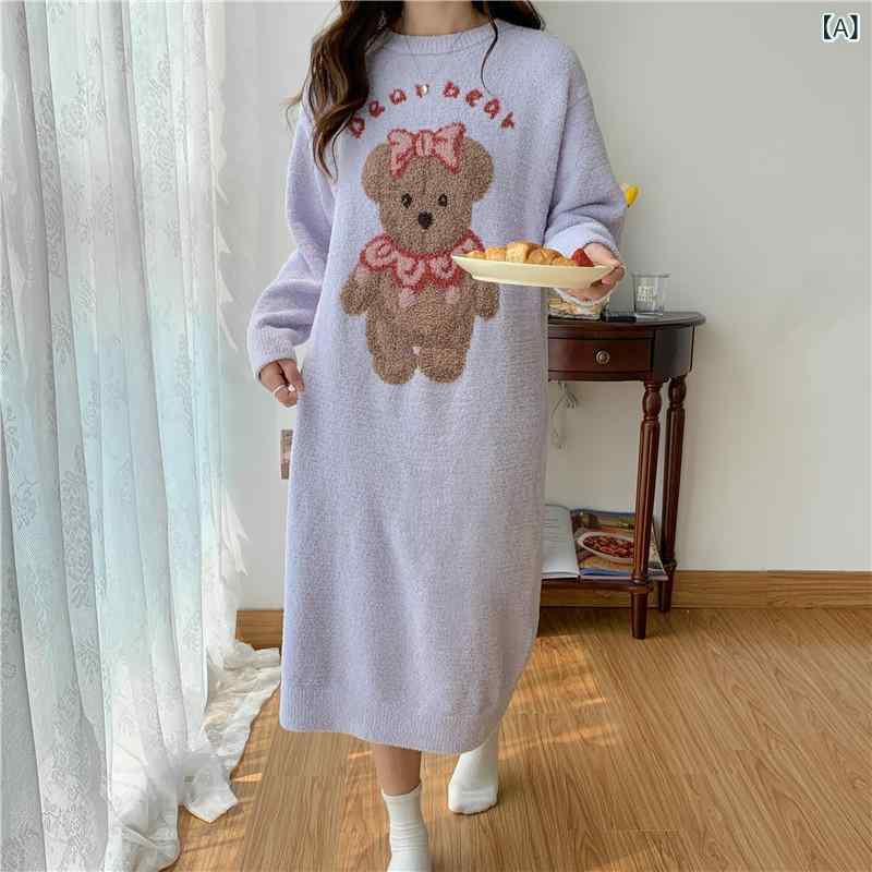 ルームウェア レディース 超厚手 ふわふわ もこもこ 保温 快適 冬用 丸首 長袖 クマ柄 リボン かわいい ポリエステル ルームワンピース ネグリジェ 部屋着