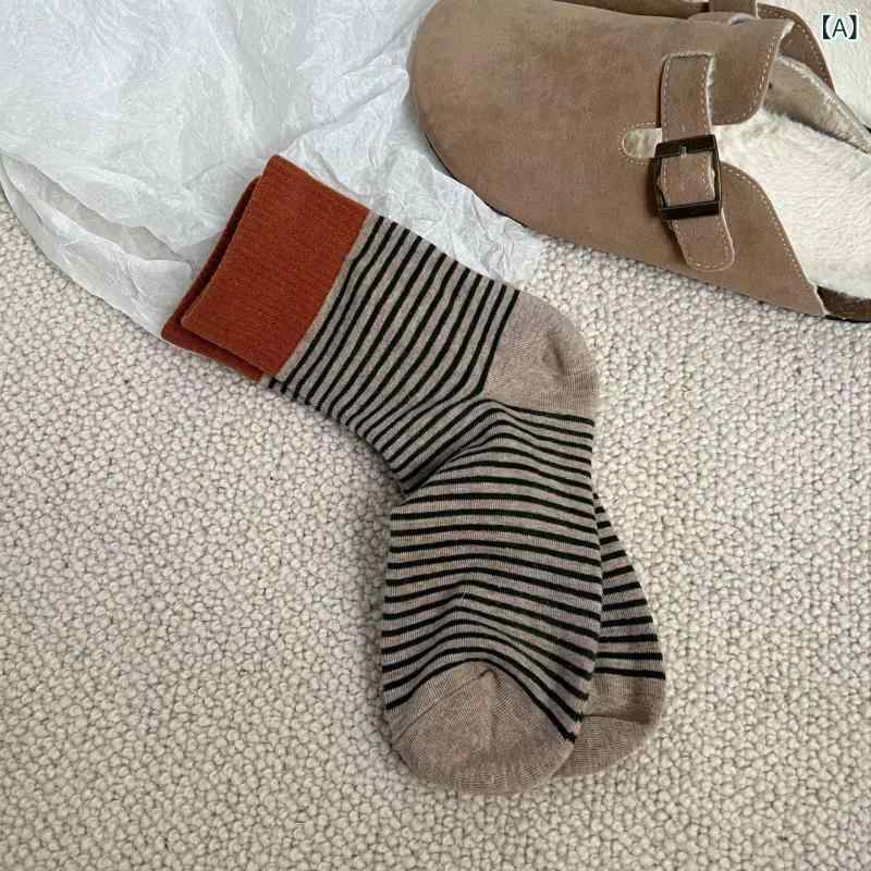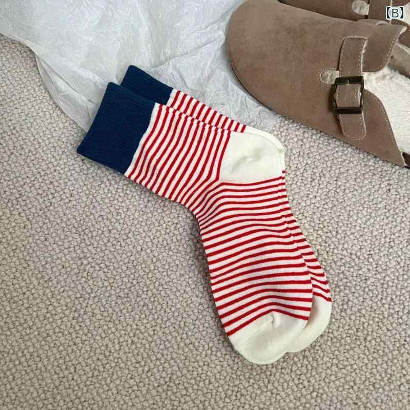 靴下 レディース 春秋 純綿 防臭 中筒丈 ソックス 韓国風 カジュアル ボーダー柄 配色 抗菌 通気性