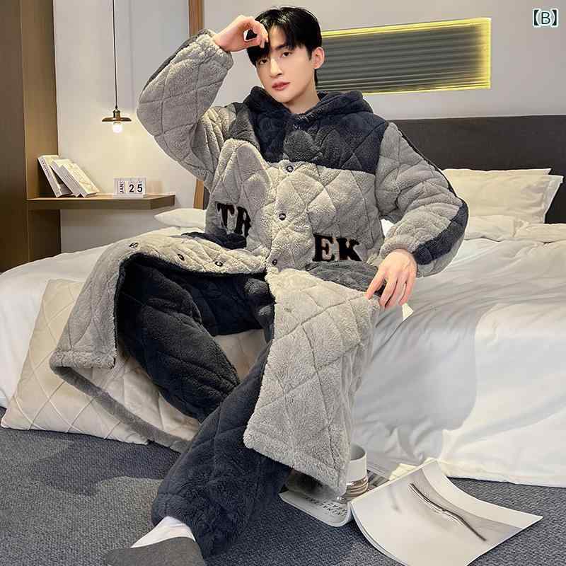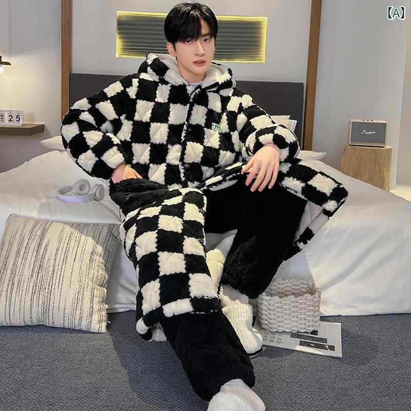 パジャマ メンズ 秋冬 保温 あったか 厚手 三層中綿入り フード付き ローブ ガウン パンツ セット 部屋着 ルームウェア 快適