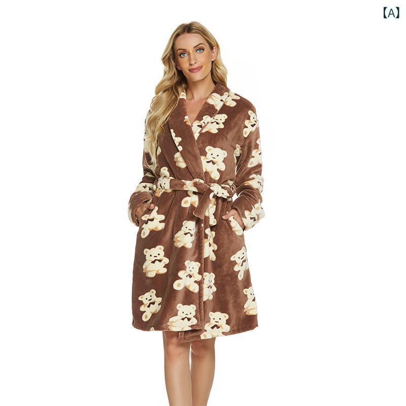 ルームウェア レディース 秋冬 暖かい フランネル 極厚 ブラウン クマ柄 襟付き バスローブ ガウン パジャマ 部屋着 フリーサイズ カジュアル 欧米風