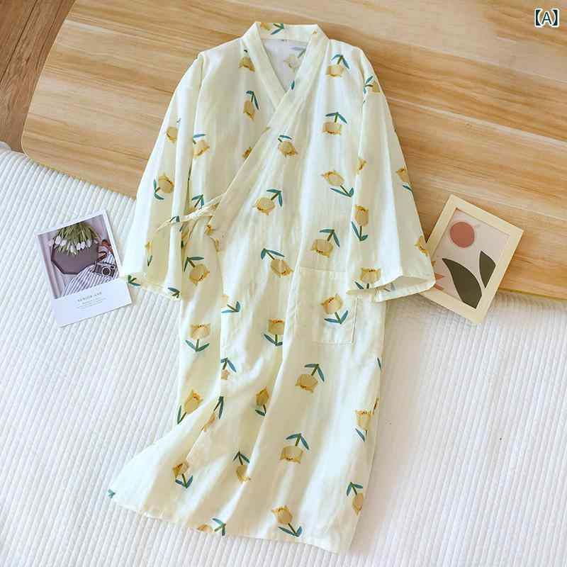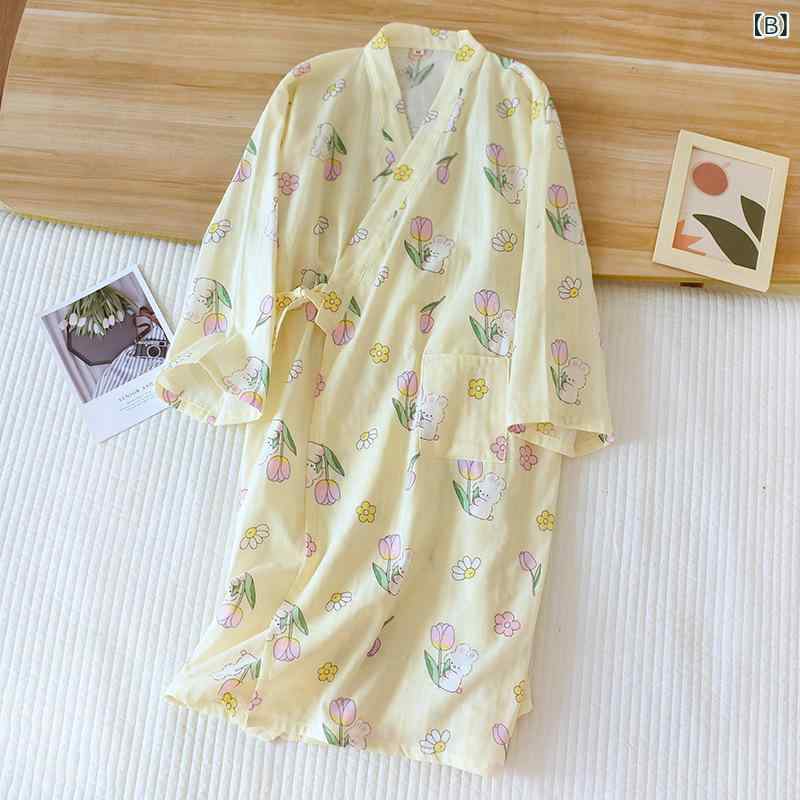 バスローブ レディース ダブルガーゼ 綿 薄手 七分袖 Vネック 帯付き 和風 部屋着 ルームウェア 春夏 サウナウェア 通気性 快適 寝巻き 湯上り