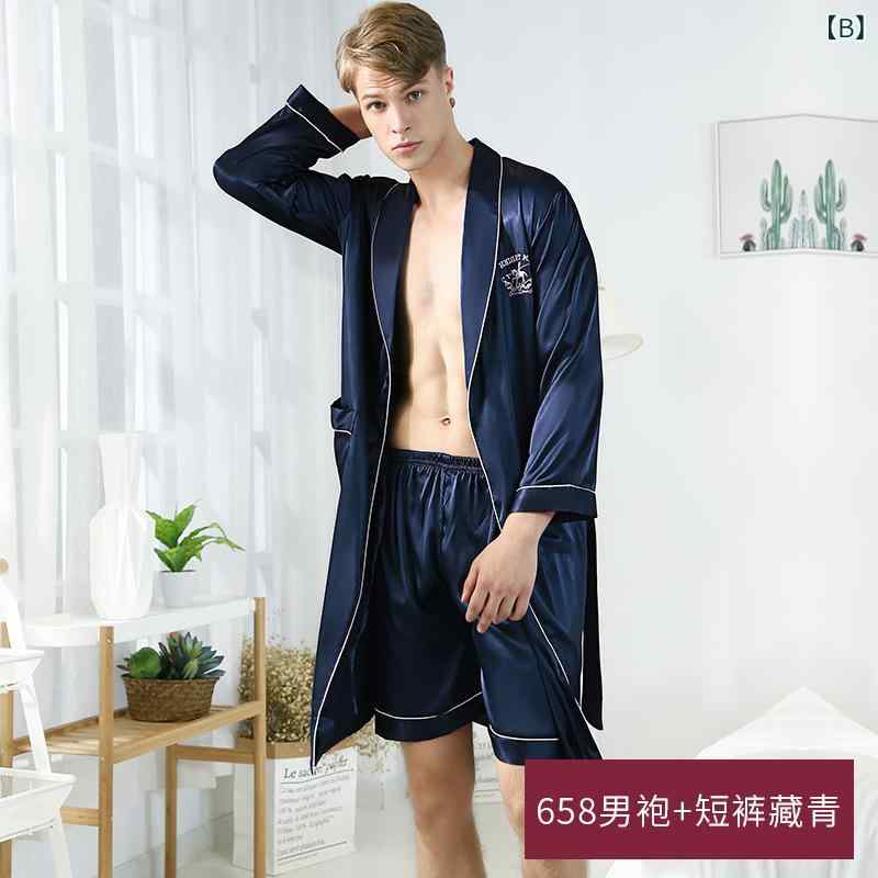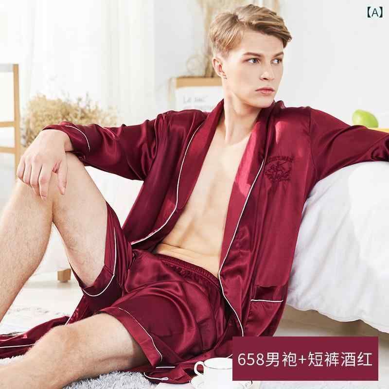 ルームウェア メンズ 接触冷感 薄手 シルク調 サテン生地 バスローブ ガウン 上下セット ショールカラー ショート丈パンツ ロング丈パンツ 部屋着 パジャマ 春夏