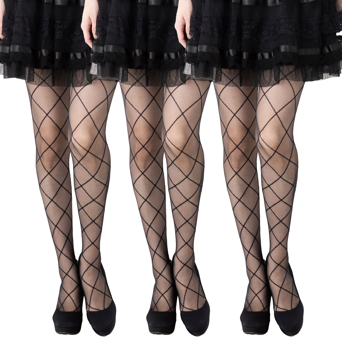 【3足セット】Point Me シアー中ダイヤ柄 ストッキング 黒 20デニール相当 M-L・L-LL レディース シアータイツ mz-ts2135-3p